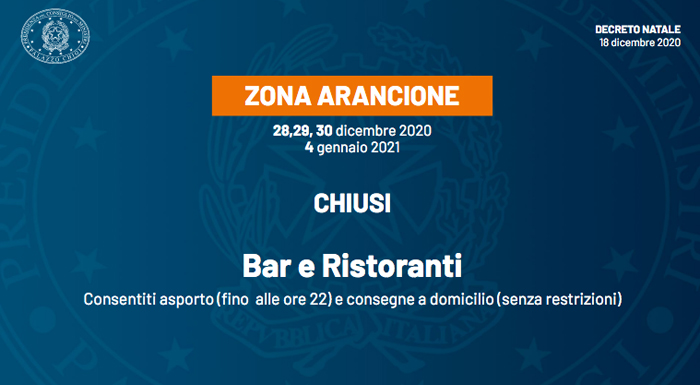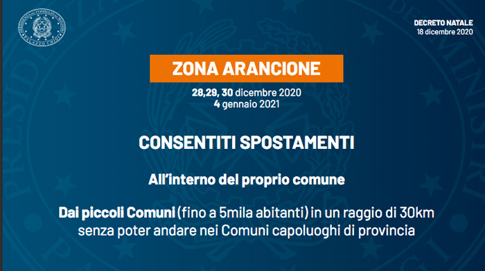 I giorni feriali 28, 29, 30 dicembre e 4 e gennaio saranno invece zone arancioni. Saranno consentiti gli spostamenti all’interno del proprio Comune di residenza senza giustificazione e tra i Comuni con meno di 5 mila abitanti nel raggio di 30 km, esclusi i capoluoghi di Provincia.