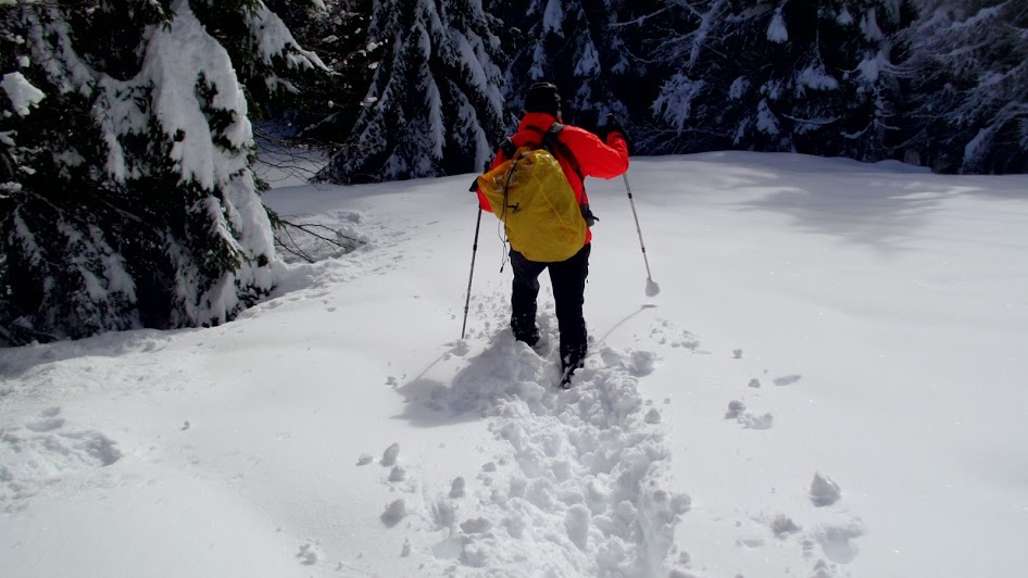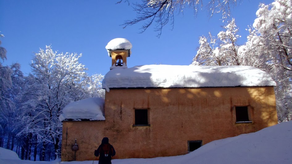 A Piazza, quota 1048, il gruppo si divide: uno di noi non è in giornata, la gita si profila molto faticosa ed in due lo accompagnano lungo un percorso più breve e meno impegnativo. Nel nostro gruppo non si resta mai da soli. Gli altri cinque raggiungono l’oratorio di Sant’Eurosia a quota 1055. Il sole scioglie la neve sugli alberi e ci si attrezza come quando piove, con copri-zaino e giacche a vento. Fino a qui poco meno di due ore (di solito ci s’impiega un'ora). Si sale a destra nel bosco e si raggiunge la bocchetta, a quota 1181, fra Cima Tondone e Cima Forcola. Fortunatamente conosciamo bene la zona ed abbiamo una guida con parenti Apache, perché la segnaletica è in buona parte nascosta dall’altezza della neve. Oggi non c’è tempo per la colazione. Un sorso di tè e si prosegue, sempre arrancando nella neve alta, fino a Cima Forcola (1303), Monte Pian Bello (1325, il punto più alto dell’escursione) e Cima Ologno (1132), fra brevi salite e lunghe discese.