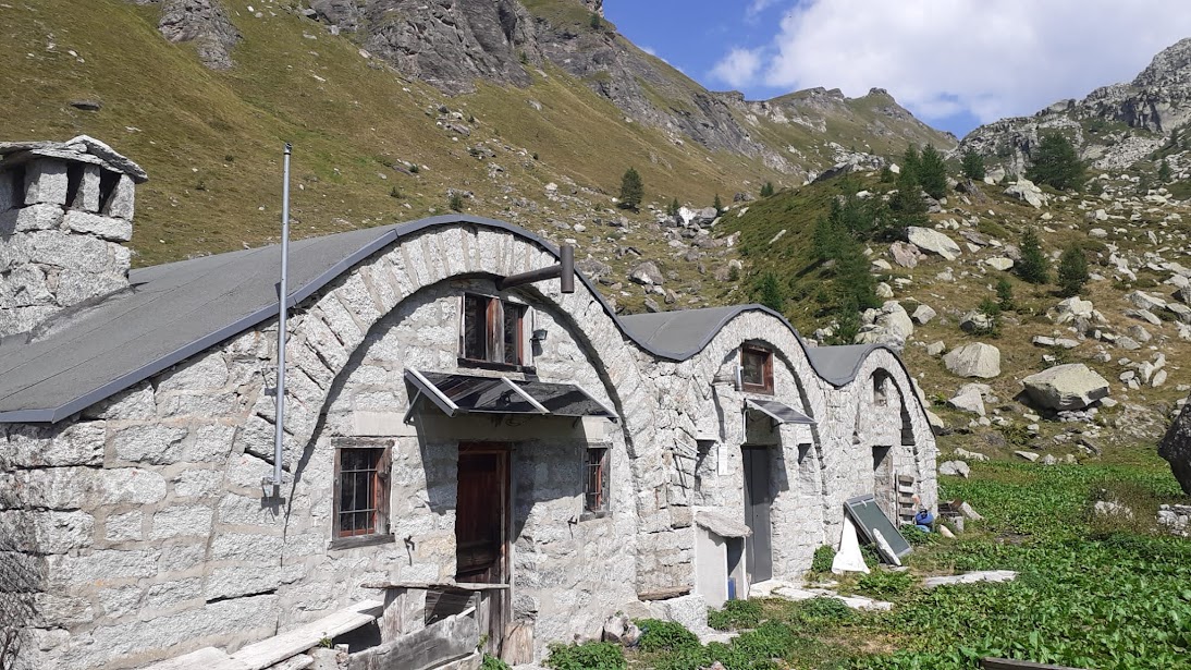 La galleria è illuminata a tempo, ma siamo comunque attrezzati con frontalini. Ben vestiti, la percorriamo di ottimo passo in poco più di un quarto d’ora. Usciamo nel piccolo piazzale dominato dalla maestosa diga del grande bacino idroelettrico di Agaro, altro ex villaggio walser sommerso nel 1938 dalle acque del Rio di Agaro. Saliamo alla casa dei guardiani e di qui ci dirigiamo a nord ovest lungo il sentiero H10, che fa parte del Tour Walser.