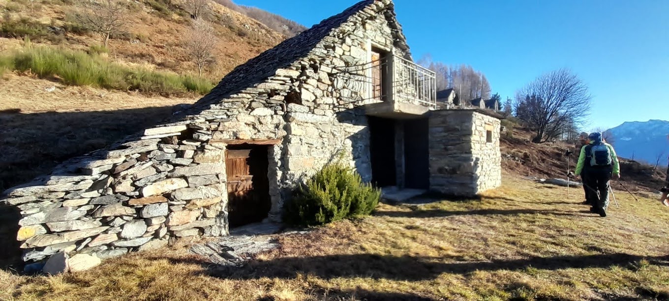 Sempre lungo il sentiero D04, evidente e ben segnato, si raggiunge l'Alpe Spino, 1550, con attenzione, che sarà raddoppiata in discesa, alle foglie in cui affondiamo quasi fino alle ginocchia (mezz’ora). Breve pausa e, fra le due baite dopo la fontana completamente gelata, si riprende a salire.