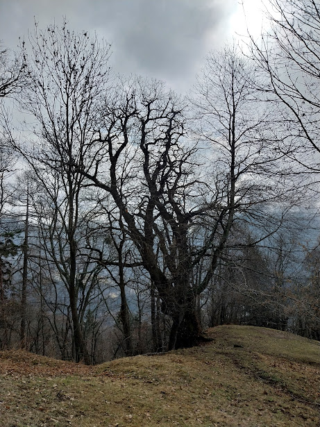 La giornata nebbiosa ci concederà anche due gocce di pioggia, due di numero, e rarissimi sprazzi di sole, ma panorama zero. Ci concentreremo meglio sulle tante cose belle e ben visibili che incontreremo. L’occhio clinico del medico esperto nota subito il mio colorito grigiastro e adegua fin da subito il passo del gruppo alle condizioni del suo anziano grafomane. La prima cosa che notiamo subito qui a Varzo, sia nei parchi di vecchie ville sia nei boschi, è la presenza di alberi “monumentali”, che meriterebbero un libro. Dal centro di Varzo, quota 560, saliamo ad imboccare il Sentiero delle Volpi che, in direzione nord ovest, ci porta rapidamente a Raguzzo, 690. Proseguiamo attraversando il grande prato e seguiamo una pista sterrata. Alla nostra sinistra la forra del Torrente Cairasca.