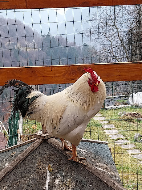 Passiamo dalla Cappella dei Rovi, 975, da Pianezzo, 1060, Fontana e Nava, 1120, Cima Coppi di oggi. Il tutto con la giusta calma, per aspettare un anziano a trazione ridotta e per gustare qualche raro sprazzo di sole che adesso ci fa compagnia. Inizia la discesa lungo il sentiero F08, che da Varzo sale verso Coatè. Ora siamo diretti a sud est. Passiamo da Cornù, 985, attraversiamo il Rio Blanca e, all’ora di pranzo, siamo a Coggia, 821, altra frazione alta (un’ora e tre quarti da Turiggia). Scorrazziamo un po’ per i vicoli e quasi ci perdiamo. Un possente gallo divedrino, con le sue povere galline spennacchiate dal suo furore, ci osserva con sguardo altero.