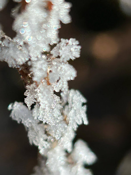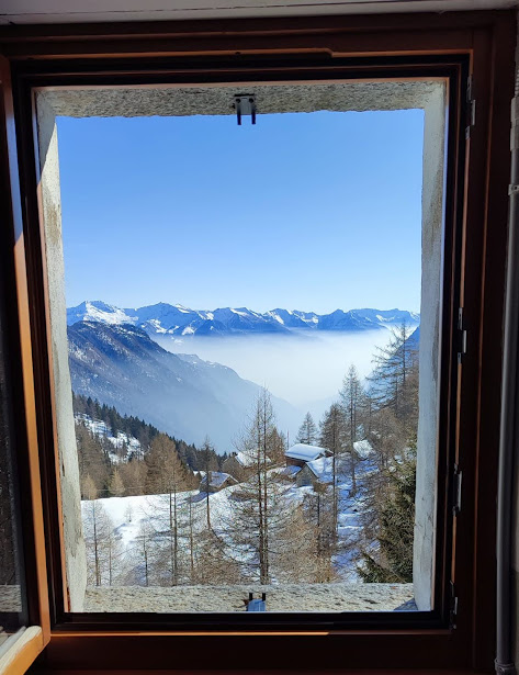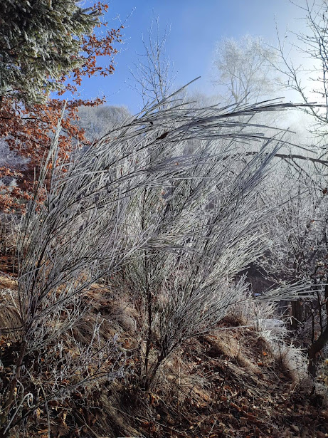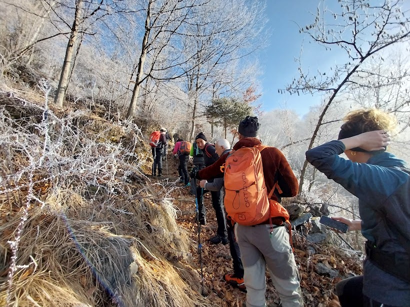 Ma procediamo con ordine. A Dreuza costeggiamo un recinto con bovini Highlander neri e passiamo da Valera. Usciamo gradualmente dalla foschia ed ammiriamo il bellissimo spettacolo della galaverna su arbusti ed alberi. Il sentiero è sempre evidente e si comincia a camminare su neve gelata. Le ciaspole non servono e ce la caviamo bene anche senza ramponcini. A Baratta, 1240, troviamo il bivio per il Passo della Colmine, sulla destra, lungo il sentiero F04. Noi teniamo la sinistra ed arriviamo ad Argnai, 1350 circa.