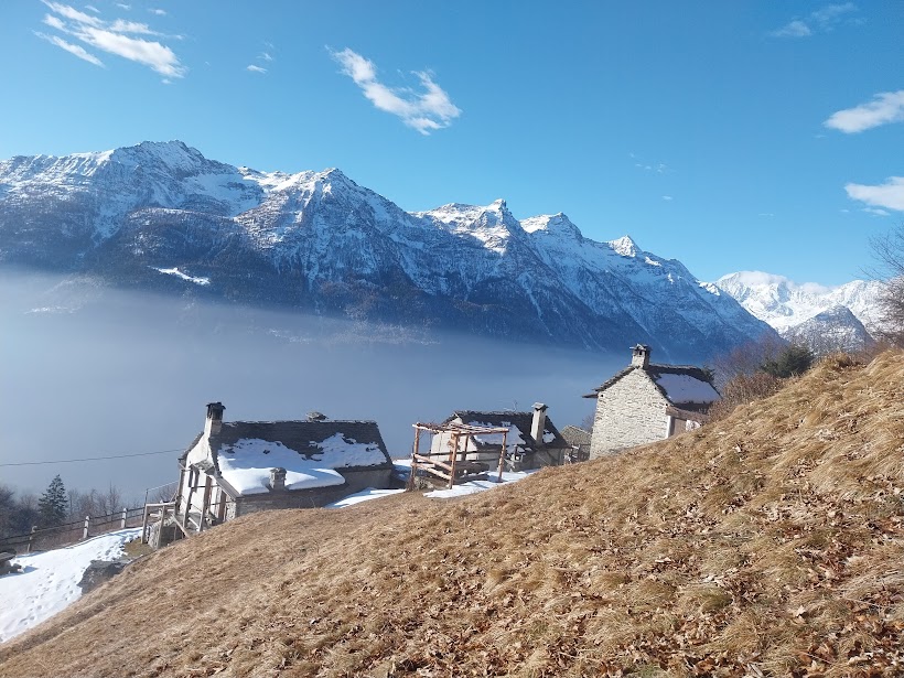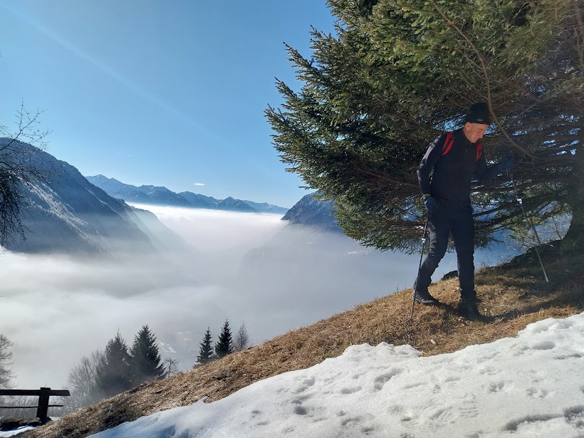 La bella giornata e la pappa in quota attirano, anche per l’opportunità di alleggerire gli zaini che, nonostante l’età e l’esperienza, sono sempre troppo pesanti, tranne quello di un quasi giovane ex alpinista di livello che tutti invidiamo. Oltre a lui e quattro anziani, ci sono oggi due medici di turno e tre badanti, una delle quali veramente giovane. Il decano di oggi è reduce da un efficace “tagliando” e sembra ritornare alle prestazioni di qualche anno fa. Caffè a Varzo e saliamo in auto a Dreuza, quota 1000. Per il rientro pomeridiano c’è già da ieri un’altra auto che ci attende dalle parti di Maulone. Si parlava di “bella giornata”, che però bisogna meritare salendo ancora un po’ a piedi. Infatti a valle e fino a quota 1200 una densa foschia ci priva del sole. Per tutto il giorno ci godremo poi dall’alto un meraviglioso mare di nuvole.