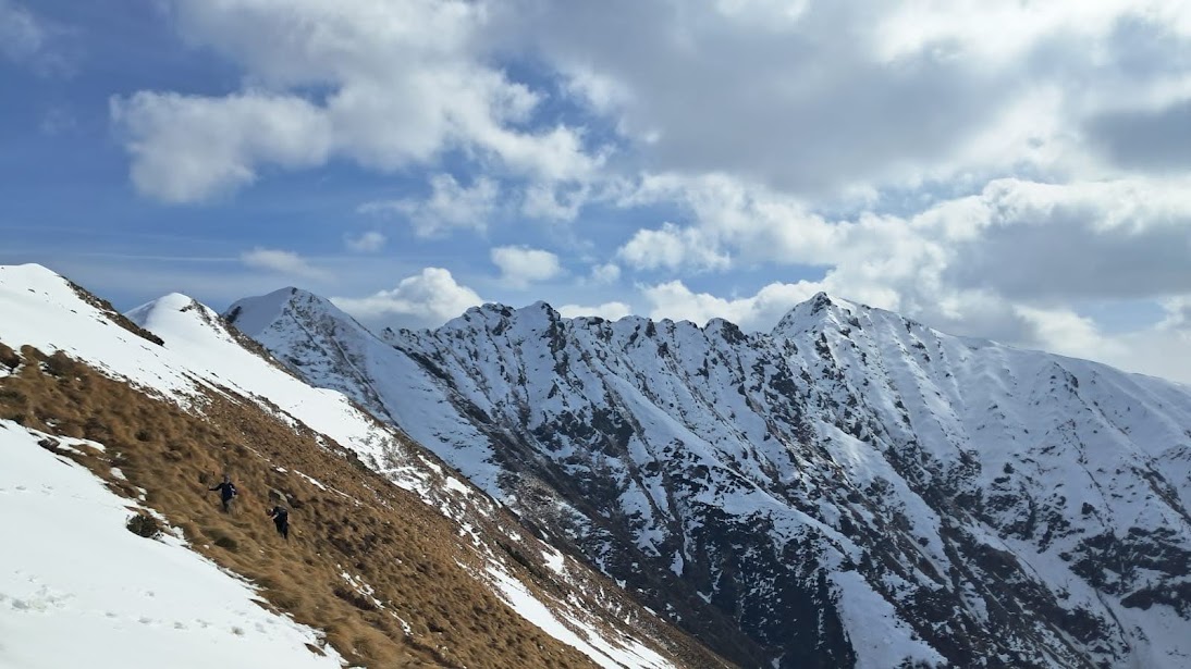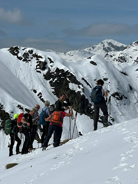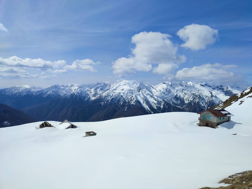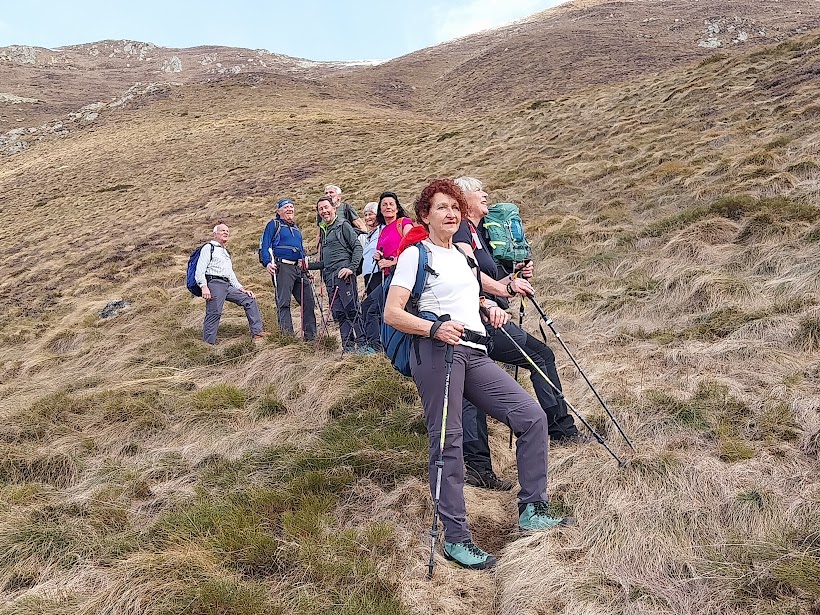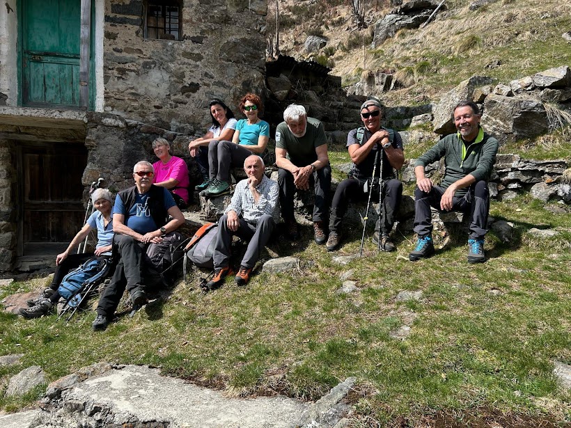 Ci abbassiamo di pochi metri sul ripido tratto erboso che domina l’Alpe Campo per la pausa pranzo. L’arietta frizzante che si fa sentire quando il sole si nasconde ci induce a rimetterci in cammino senza troppe pennichelle. Prima pestiamo un po’ di neve, poi gli erboni ripidi ed infine il sentiero evidente. Dopo meno di un’ora siamo nuovamente all’Alpe Cortone e ci concediamo una lunga pausa dedicata a foto di gruppo e discussioni “profonde”.