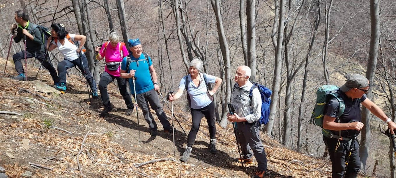 Accuserà la fatica solo all’arrivo, ma le cure delle badanti per ora lo galvanizzano. Attraversiamo belle faggete e incontriamo le prima tracce di neve intorno a quota 1500. Il sentiero per ora è evidente e “non molla” mai. Poco sotto l’Alpe Campo, anche per colpa della neve e della mancanza di segni, lo perdiamo e saliamo nei ripidi prati in ordine sparso fino ad arrivare all’altezza dell’Alpe alla nostra sinistra, 1739. Nel pianoro la diversa incidenza dei raggi solari ha lasciato molta neve, che evitiamo tenendoci più in alto, sul ripido pendio erboso che ci porta alla Colma di Pianello, sulla cresta fra Mazza dell’Inferno e Croce del Campo, fra Ossola e Strona, a quota 1780 circa (un’ora e un quarto). Panorama stupendo sull’Ossola e oltre, anche se qualche nuvola nasconde un po’ i Quattromila.