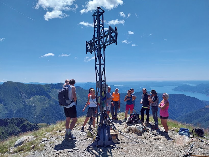 Gli amici pazienti ci aspettano in vetta, 2195, (un'ora e mezza per i ritardatari), e qui si festeggiano due prime salite al Laurasca, il panorama spettacolare, la bella compagnia ed un sublime bianco della Provenza il cui peso è forse stato una delle cause dei crampi. In discesa alcuni passano dall'Alpe Scaredi, altri svoltano a destra un po' troppo presto e si inventano un nuovo percorso di discesa a Cortevecchio (un'ora e un quarto). Qui a tavola il tempo vola e scendiamo “un po'” sul tardi (un'ora e un quarto). Ci resta il tempo di celebrare gli ottant'anni dell'amico che mi disse, sotto sforzo, una frase che mi ha insegnato molto: “Dai ch'ai catum!”.