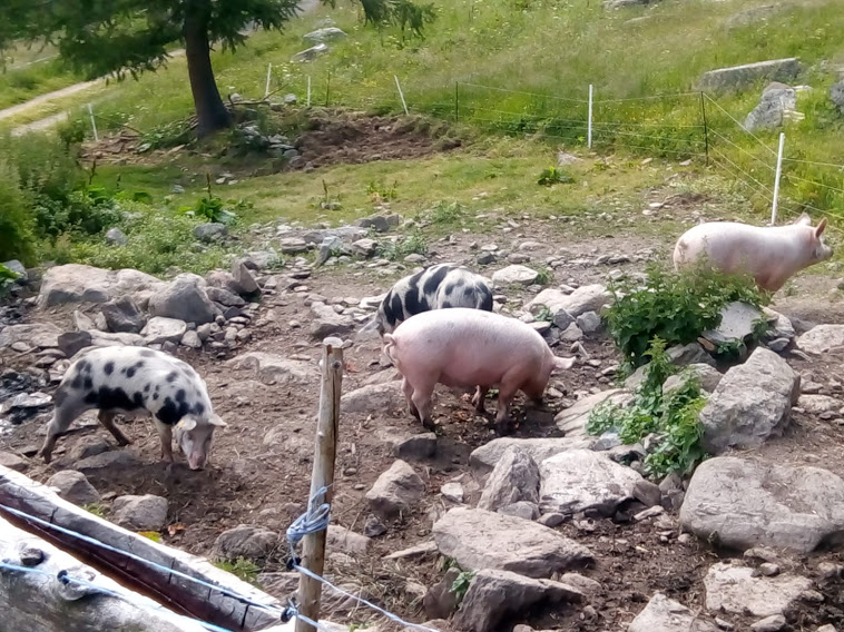 Attraversiamo il lungo ponte verso est ed imbocchiamo il sentiero che, tagliando a volte la strada, la riprende nell’ultimo tratto pianeggiante e ci porta all'Alpe Possette o Pussetta. Il sentiero è ben segnato e ben raccordato con la strada. Non saremo per caso in Svizzera? A sinistra si sale al Monscera. Noi teniamo la destra virando gradualmente a sud e saliamo all'Alpe Waira, 1854, ben dotata di pannelli solari e raggiunta anche dalla strada sterrata. Camminiamo da poco più di un’ora e un quarto. Siamo nella valle laterale di destra orografica che confina con la bella e indisciplinata Italia attraverso il Passo di Monscera. All’alpe parliamo di formaggio con i pastori e fotografiamo i maiali rossocrociati con le maglie della Juventus, rosa e bianconere.