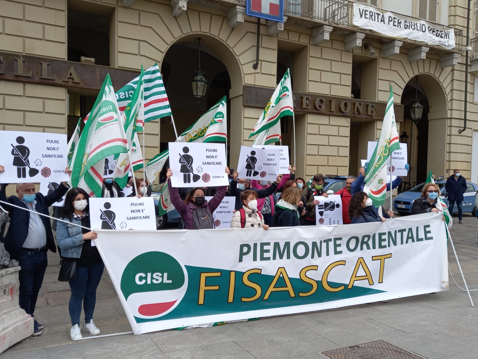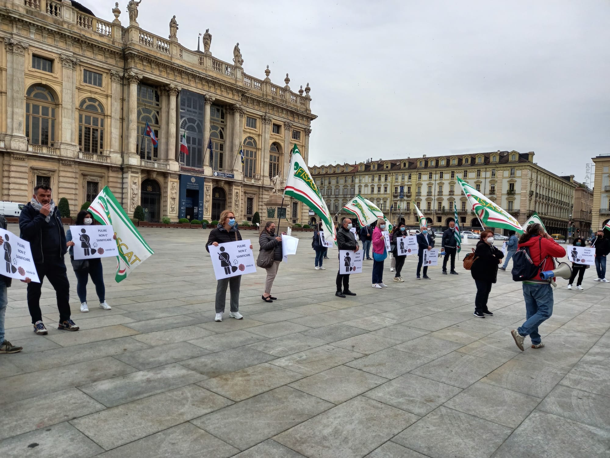 TORINO - 26-04-2021 - Alcune decine i lavoratori del settore di pulizia e sanificazione del Piemonte Orientale (Novara, Vercelli, Biella e Verbania) oggi hanno manifestato in piazza Castello a Torino, sotto la sede della Regione, contro gli eccessivi ribassi dell'appalto, aggiudicato alla società Markas Srl con un meno 30,12 % sulla base d'asta per il servizio nelle aziende sanitarie del territorio. Il timore è che un tale ribasso penalizzerà lavoratori e qualità del servizio. La Fisascat Cisl Piemonte Orientale ha proclamato per oggi lo sciopero del comparto per l’intera giornata. Sono circa 600 i lavoratori interessati. "Vogliamo massima trasparenza sul lotto 5 – spiegano i segretari generale Fisascat Cisl e Cisl Piemonte Orientale, Luca Trinchitella ed Elena Ugazio – che riguarda la pulizia e la sanificazione nelle aziende ospedaliere delle provincie di Biella – Novara – Verbania – Vercelli. Considerato che il costo del lavoro in appalti di questa natura rappresenta circa l’85% del totale dell’appalto, appare chiaro che un ribasso di tale portata non potrà che avere riflessi molto negativi sia nei confronti dei lavoratori, in termini di ore lavorate e sicurezza, sia nella qualità dei servizi delle strutture interessate”.