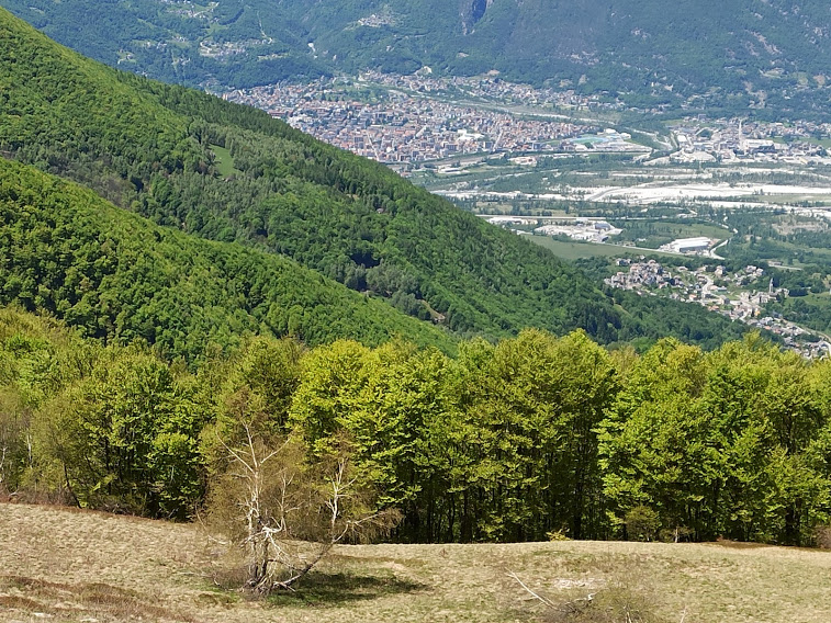 La sacra regola del saper rinunciare, che ci ha permesso di superare i sessanta e anche i settant'anni, viene applicata senza esitazione. Se ne riparlerà fra un mese. Il vano tentativo ci ha portato via mezz'ora. Le incisioni rupestri di Sassoledo, che sono lì forse da millenni, possono aspettare ancora qualche settimana. Dopo la lunga e tranquilla pausa pranzo a Roi iniziamo la discesa lungo il percorso di salita. Passiamo da L'Erta e, a quota 850, incontriamo un bivio con un sentiero evidente a sinistra, anche questo indicato sulla cartina come “non segnalato”, che dovrebbe portare direttamente a Verigo, attraversando il Margologio più in alto di stamattina. Purtroppo, dopo un quarto d'ora, scompare nel nulla.
