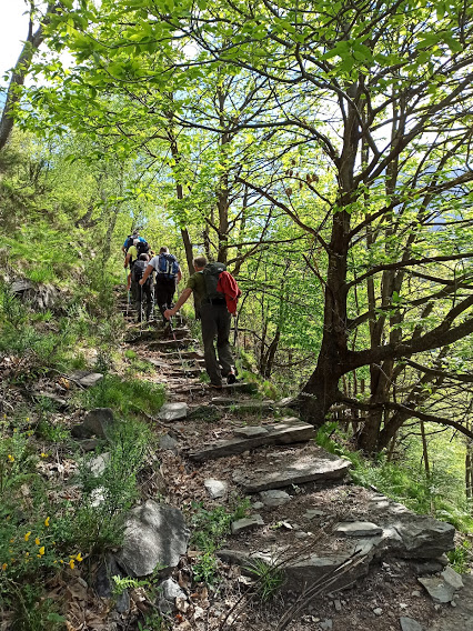In nove ci ritroviamo nella piazzetta di Altoggio, 742, la frazione più alta e soleggiata del comune di Montecrestese. La giornata per ora è bella e, su consiglio di esperti meteorologi, lascio l’ombrello in auto. Una paziente signora sopporterà per tutto il giorno otto pensionati più o meno anziani, fra i quali un ex alpinista ignoto. In orario “umano” attraversiamo la frazione e, dopo l’Oratorio di San Giovanni, teniamo la destra lungo i prati fino alla Cappella di Cimavalle, 754.