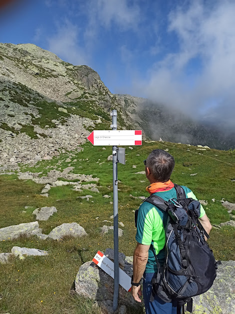 Qui un’indicazione sarebbe indispensabile, ma non c’è. In più è l’unico momento della giornata in cui le nuvole basse prevalgono e la visibilità scarseggia. La cartina, a dire il vero, dà l’indicazione corretta, che sarebbe quella di seguire la traccia di sinistra, sud est, e scendere verso il Monte del Dente a incontrare il sentiero D14 ch sale dalla Gomba al Lago di Oriaccia, ben segnato. Noi scegliamo una scomoda scorciatoia, salendo di qualche decina di metri a nord ovest, destra, e scollinando su una vasta e ripida pietraia, dove scendiamo di oltre un centinaio di metri verso occidente con percorso libero. Incrociamo il sentiero D14 e saliamo in breve al Lago di Oriaccia, 2128. A parte le brevissime pause, ci accorgiamo di averci impiegato quasi tre ore, alla faccia del cartello a San Bernardo. Tutto bello: a nord ci domina il Verosso, a sud ovest si potrebbe proseguire per l’Alpe Laghetto, ma il percorso si allungherebbe troppo.