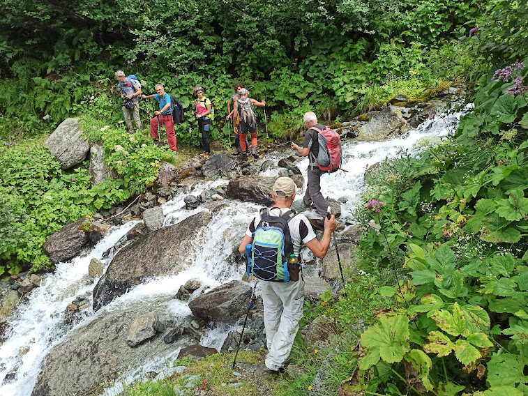 Su pendenze meno ripide rispetto alla scorciatoia del mattino caliamo a valle ed arriviamo a chiudere l’anello odierno al bivio dove l’avevamo imboccata. Ci ricompattiamo mentre un anziano un po’ distratto si apparta un attimo per l’espletamento di una rapida funzione fisiologica. Il tutto rivolto verso un oggetto misterioso che scopriremo essere una fototrappola. Speriamo vivamente che, invece del passaggio di un lupo, non sia stato eternato qualcos’altro. Arriviamo al ponte che ci riporta sulla sinistra orografica ed al bacino di Fah (un’ora e un quarto). Alcuni sulla mulattiera del mattino e gli altri rimanendo sulla strada sterrata scendiamo a ricongiungerci a Tannuwald.