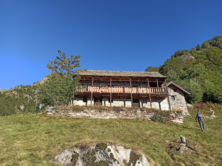 Molto simili, ma di provenienza diversa, sono le mucche Highlander scozzesi che abbiamo incontrato in Valle Vigezzo e in Valle Isorno negli anni scorsi. Usciamo dal bosco ed attraversiamo su un ponticello di legno il Rio Lasino, passando sulla destra orografica. L’ultimo strappo lungo il sentiero sempre evidente ci porta all’Alpe Asinello, 1831, in poco meno di un’ora. I forti del gruppo, cioè gli altri cinque, proseguirebbero volentieri, ma si lasciano contagiare dalla mia pigrizia e ci crogioliamo al sole di questa giornata ancora estiva.