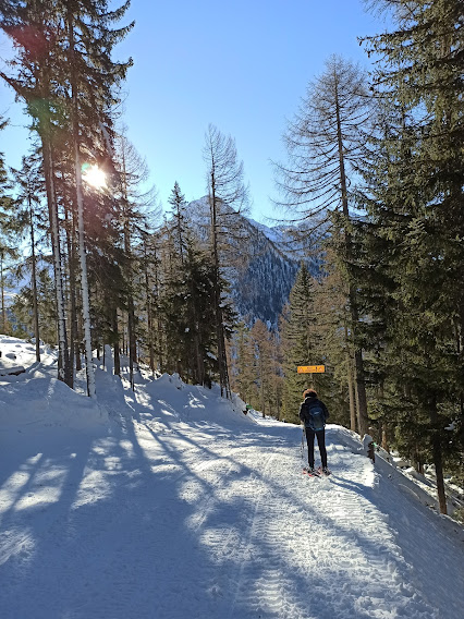 E così scegliamo un po’ di avventura su un terreno ideale per goderci le ciaspole. Prima di attraversare il torrentello che porta alle baite di Wintrigmatte, teniamo la destra e ci alziamo sul pendio ricoperto di neve vergine. Sprofondiamo leggermente anche con le ciaspole, pur seguendo la traccia dei due sciatori.