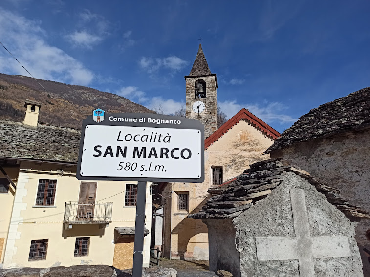 Percorriamo il sentiero evidente, tranne che per le cartine, e ben segnato che, passando dalla Cappella dell’Arisc, scende a Messasca, 557, e di qui ci portiamo sulla strada provinciale. Risaliamo verso Bognanco fino al bivio per San Marco, 580, che raggiungiamo in poco più di mezz’ora.