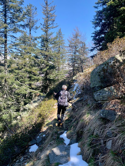 Ieri una telefonata quasi allarmata di un ex alpinista acciaccato, oggi presente, mi aveva preannunciato montagne di neve su ripidi pendii sia a sud che a nord della vetta. E dire che dal basso si vedeva un paesaggio estivo. In effetti saliamo nel ripido bosco, ginocchia in bocca, incontrando, quasi in vetta, nevai da dieci centimetri per dieci, spessi qualche millimetro. Potete immaginare la sfilza di battute molto ironiche che richiamano chiodi da ghiaccio, piccozze con due c (vedi Zingarelli) e ramponi a dodici punte.