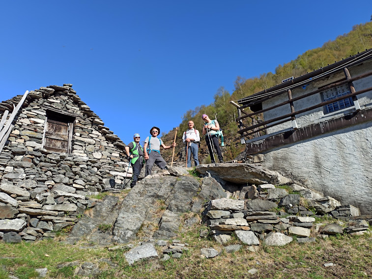In questo tratto, esposto a nord ovest, troviamo effettivamente qualche centimetro di neve che serve soltanto ad alzare il livello delle nostre burle infantili. Sui due comodi tavoli esterni di sasso ripristiniamo le energie al caldo sole di fine aprile. Puntiamo poi su Villadossola, passando dall’Alpe Baldana, 1215, dall’Alpe Vancone, 988, incrociando la strada asfaltata e raggiungendo l’Alpe Corticcio, 784. Fino a qui il sentiero evidente è anche pulito.