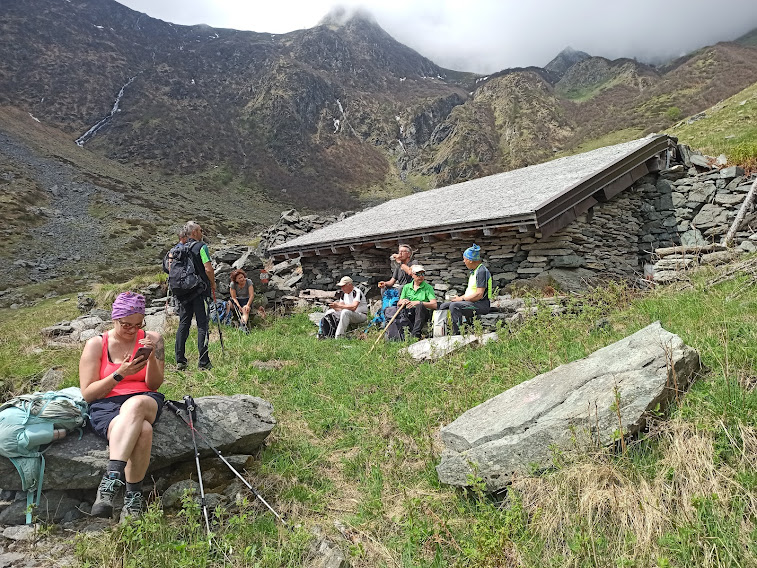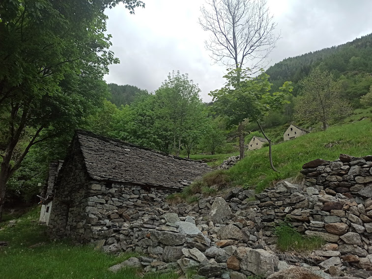 Più in alto ecco l’Alpe Agrosa, 1726, dopo due ore e un quarto di cammino effettivo. Il tempo incerto abbrevia la nostra sosta. Ci sono cartelli indicatori gialli e rossi inutilizzabili, ma il sentiero D20, che ora punta a nord, è abbastanza evidente. In poco più di mezz’ora, dopo una breve discesa per attraversare un torrentello che confluisce nel Rio Straciugo, saliamo a Campo, 1895, e qui pranziamo. Sulla cartina questo è Campo, mentre l’Alpe Campo è indicata a quota 2200, in prossimità dei laghetti omonimi.