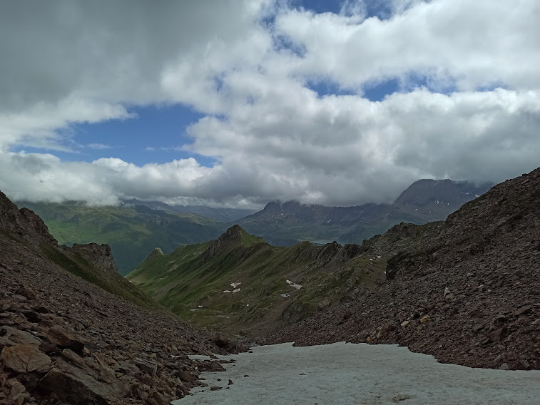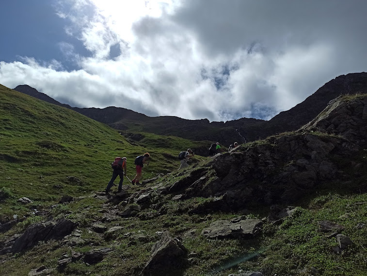 Ridiscendiamo a quota 2400, in zona riparata e in uno splendido verde, per la pausa pranzo. Le nuvole sono sempre più minacciose. Non seguiamo il percorso di salita, ma puntiamo decisamente a nord, lungo una traccia che ci mantiene alti rispetto al vallone di Nefelgiù alla nostra sinistra (occidente).