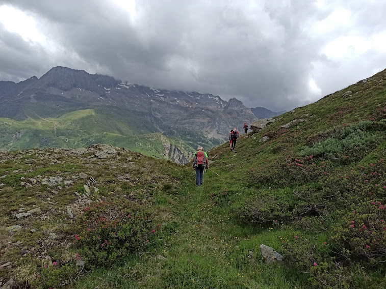 La presenza della nostra prestigiosa guida walser ci fa optare per l'alta Val Formazza. Le previsioni sono buone, ma oggi la nostra fiducia sarà tradita. Siamo in sei e la formazione odierna prevede anche il medico di turno e la badante titolare. Parcheggiamo al Rifugio Bim Se, sotto la diga di Morasco, 1800. Per ora splende il sole. Sul sentiero G95 della GTA arriviamo all'Alpe Nefelgiù, 2048, nella parte iniziale e pianeggiante del maestoso vallone che s'inerpica verso sud (poco meno di un'ora). Più avanti abbandoniamo l’evidente sentiero che sale al Passo di Nefelgiù e seguiamo la guida su tracce che lui ben conosce, tenendo la sinistra.