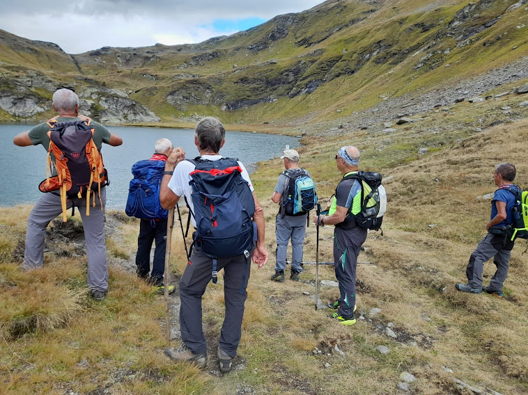 Al Lago di Poiala o Beyelesee, 2305, il sole ci abbandona e soffia un venticello fresco. I più freddolosi, dopo mesi di saune alpine, apprezzano nuovamente il piacere di camminare in montagna con giaccavento, guanti e berretto. Costeggiamo il meraviglioso specchio d’acqua e raggiungiamo il Passo, anche lui “di Poiala” o Hinnerlecka, 2411, Cima Coppi di oggi (un’ora e mezza).