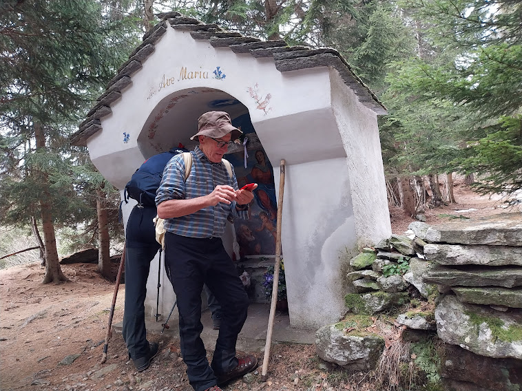 Per nostra fortuna, cioè di noi che amiamo la montagna e i rifugi gestiti da professionisti, il CAI Gallarate ha rinnovato per l’ennesima volta il contratto di gestione del rifugio ai nostri amici. L’ospitalità di Marina e la pappa che ci prepara sono sempre di alto livello. A malincuore, dopo più di due ore di totale oblio dei problemi del fondovalle, ci rimettiamo in marcia. Adesso splende anche il sole. La pigrizia “digestiva” ci fa optare per la strada. Prima di Astolo, invece di proseguire diritti verso Maulone, prendiamo alla nostra sinistra la strada, già incrociata in salita, che scende a Dreuza e Coggia. La seguiamo fino ad incrociare nuovamente il sentiero F06 del mattino, che percorriamo fino all’altezza di Baratta.