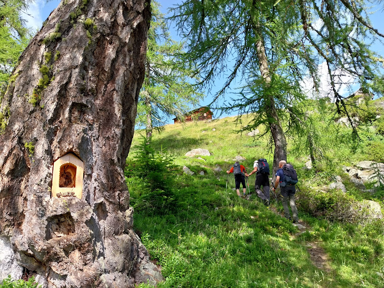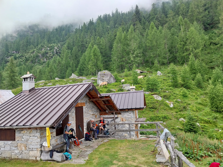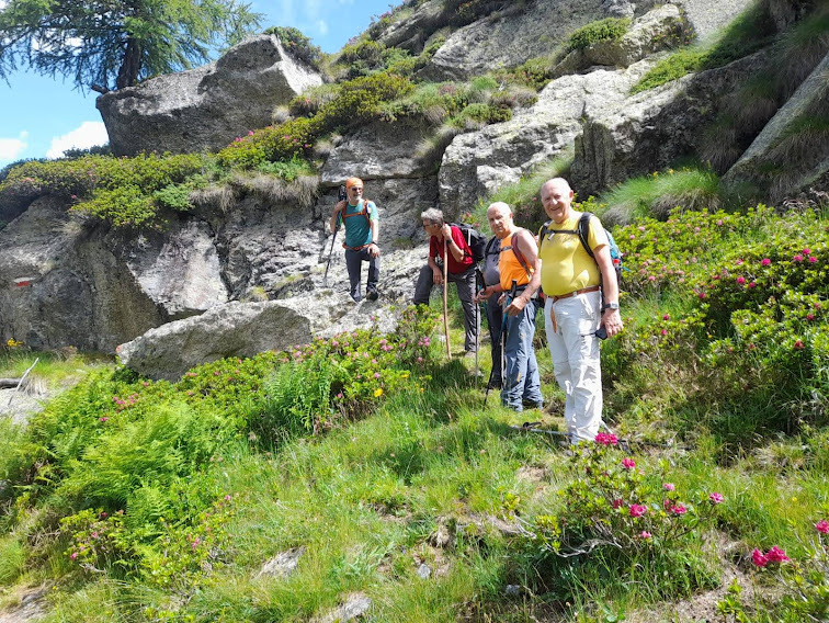 Il gruppo A, composto da quelli più in forma, si avvia verso la Val Tignaga e salirà al Passo dall’Alpe Piana di Ceppo Morelli, dalla Cappella del Cour Gil e dagli alpi Corte Sotto e Cascina Nuova. Il gruppo B, di cui faccio parte, composto anche dall’ex alpinista acciaccato e da due illustri soci (presidente e medico) al rientro dopo un periodo difficile, si avvia lungo il sentiero B 23 verso l’Alpe Laveggio.