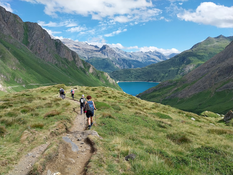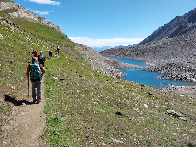 Il sole pallido di oggi non toglie nulla ad un panorama spettacolare. Foto di rito, contemplazione e ripercorriamo la cresta verso occidente ed il tratto ripido, che in discesa richiedono ancora più attenzione. In una bella conca riparata dal venticello frizzante sostiamo per il pranzo. Ripercorriamo il tragitto del mattino lungo il bel sentiero che si potrebbe veramente chiamare l’autostrada delle Alpi, dove incontriamo tanta gente, anche in bicicletta.